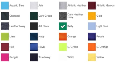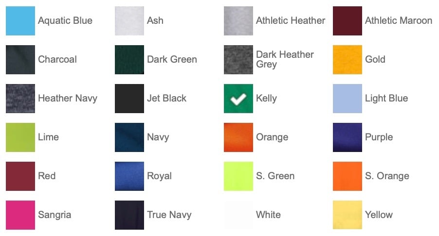 50/50 cotton/poly (Dark Heather Grey, Heather Navy, S. Green, S. Orange)