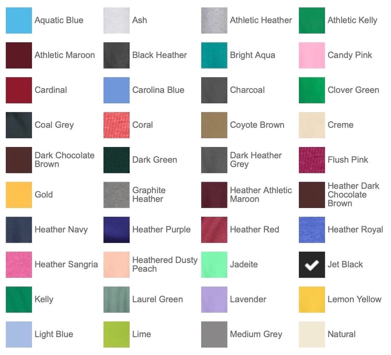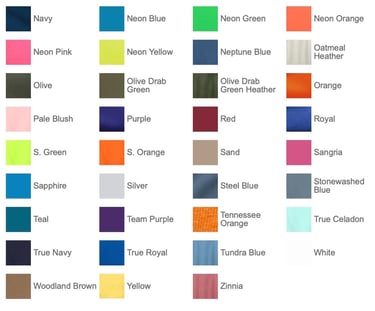 50/50 cotton/poly (Black Heather, Dark Heather Grey, Graphite Heather, Heather Athletic Maroon, Heather Dark Chocolate Brown, Heather Navy, Heather Purple, Heather Red, Heather Royal, Heather Sangria, Heathered Dusty Peach, Neon Blue, Neon Green, Neon Orange, Neon Pink, Neon Yellow, Oatmeal Heather, Olive Drab Green Heather, S. Green, S. Orange)