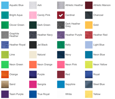 50/50 cotton/poly (Dark Heather Grey, Graphite Heather, Heather Navy, Heather Purple, Heather Red, Heather Royal, Neon Blue, Neon Green, Neon Orange, Neon Pink, Neon Yellow)